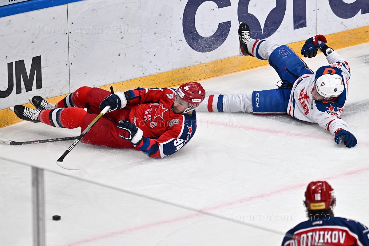 Континентальная хоккейная лига (КХЛ). Чемпионат сезона 2022/23. Финал запад. Матч между командами ЦСКА (Москва) - СКА (Санкт-Петербург) на стадионе "ЦСКА Арена". Игрок команды СКА Степан Фальковский (слева) во время матча.