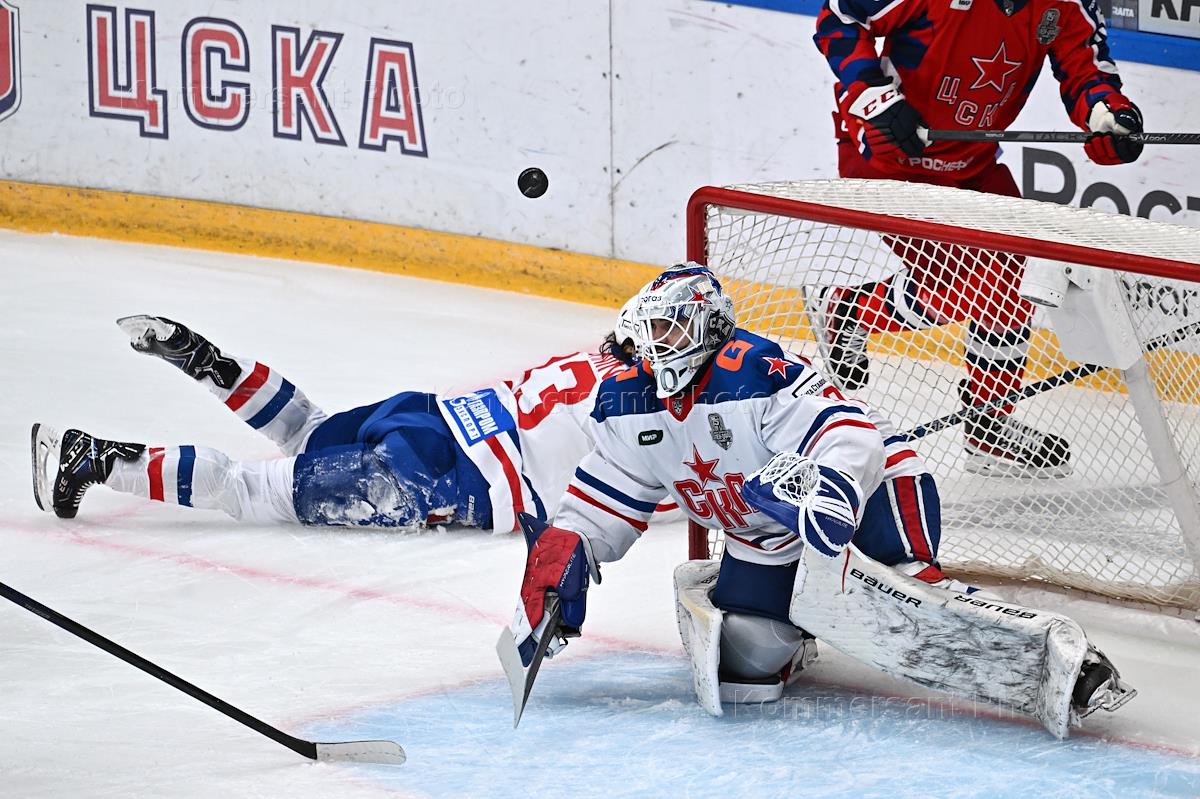 Континентальная хоккейная лига (КХЛ). Чемпионат сезона 2022/23. Финал запад. Матч между командами ЦСКА (Москва) - СКА (Санкт-Петербург) на стадионе "ЦСКА Арена". Вратарь команды СКА Дмитрий Николаев (в центре) во время матча.