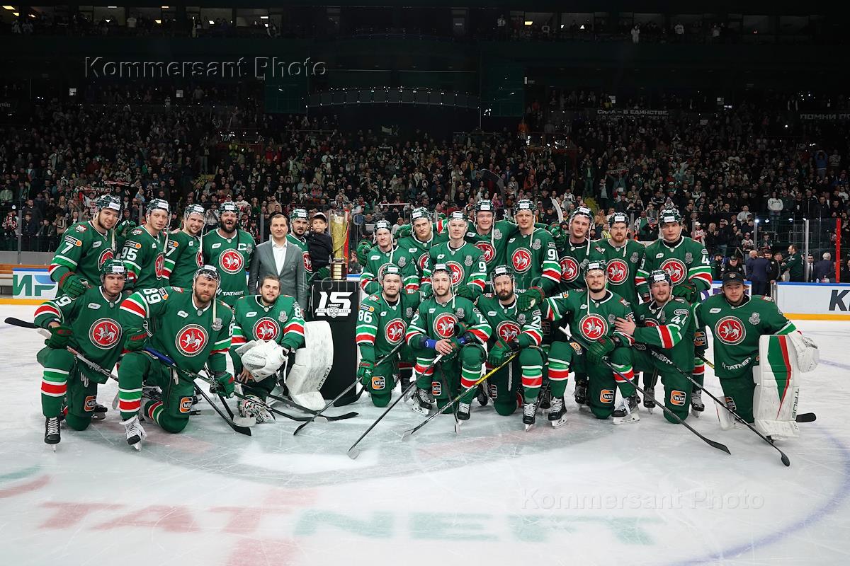 Континентальная хоккейная лига (КХЛ). Чемпионат сезона 2022/23. Финал восток. Матч между командами "Ак Барс" (Казань) и "Авангард" (Омск) на стадионе "Татнефть-Арена". Команда "Ак Барс" после церемонии награждения победителей матча.