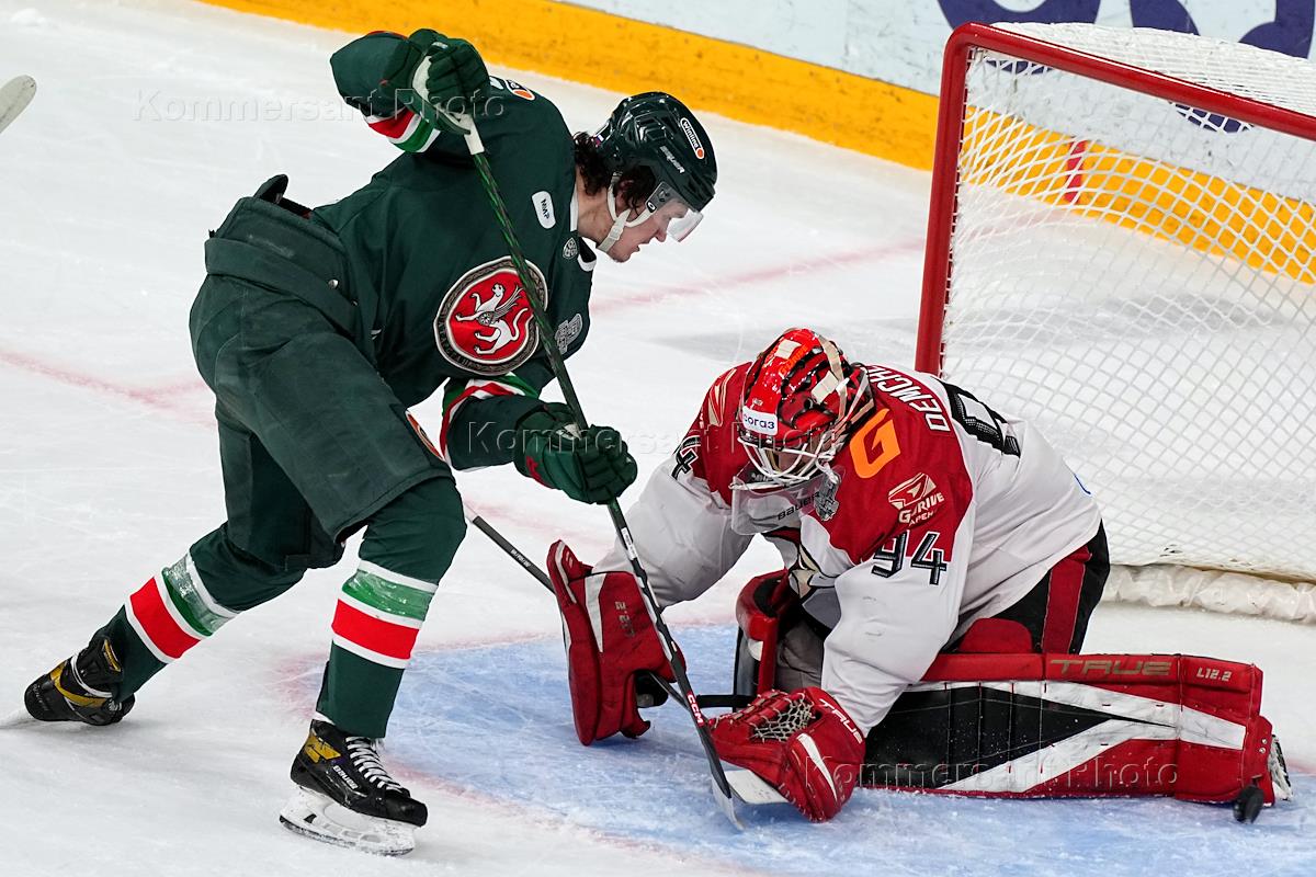 Континентальная хоккейная лига (КХЛ). Чемпионат сезона 2022/23. Финал восток. Матч между командами "Ак Барс" (Казань) и "Авангард" (Омск) на стадионе "Татнефть-Арена". Вратарь команды "Авангард" Василий Демченко (слева) во время матча.