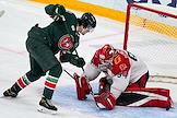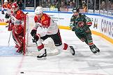 Континентальная хоккейная лига (КХЛ). Чемпионат сезона 2022/23. Финал восток. Матч между командами "Ак Барс" (Казань) и "Авангард" (Омск) на стадионе "Татнефть-Арена". Вратарь команды "Авангард" Василий Демченко (справа) во время матча.