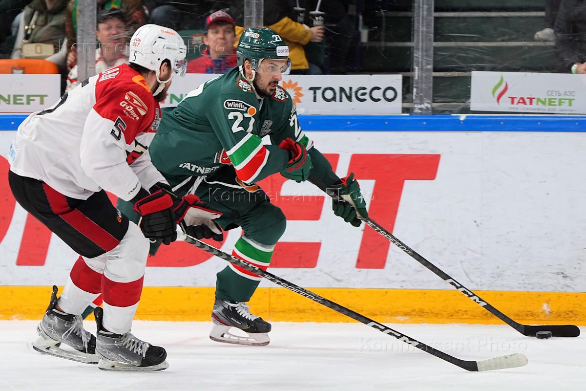 Континентальная хоккейная лига (КХЛ). Чемпионат сезона 2022/23. Финал восток. Матч между командами "Ак Барс" (Казань) и "Авангард" (Омск) на стадионе "Татнефть-Арена". Игрок команды "Ак Барс" Александр Радулов (справа) во время матча.