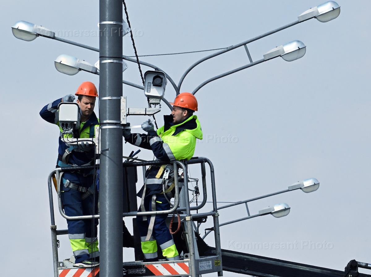 Монтаж новых стационарных комплексов фотовидеофиксации "Азимут-4" на трассе М-5 "Урал". Жанровая фотография.