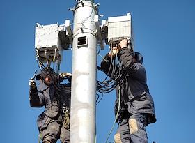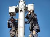 Виды Санкт-Петербурга. Жанровая фотография. Монтажники во время установки оборудования на антенной вышке на проспекте Ветеранов.