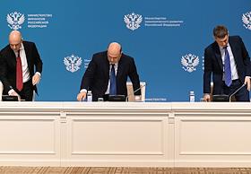 Расширенное заседание коллегии Министерства финансов и Министерства экономического развития "Основные результаты деятельности в 2022 году и задачи на 2023 год" в Доме правительства России. Слева направо: министр финансов России Антон Силуанов, министр экономического развития России Максим Решетников и председатель правительства России Михаил Мишустин во время заседания.