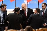 Совместное заседание коллегий министерства финансов и министерства экономического развития "Основные результаты деятельности в 2022 году и задачи на 2023 год" в Доме правительства России. Помощник президента России Максим Орешкин (в центре) перед началом заседания.