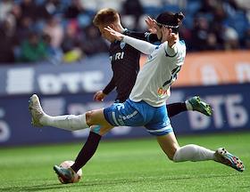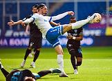 Российская Премьер-Лига (РПЛ). МИР - Чемпионат России по футболу 2022/2023. 23-й тур. Матч между командами "Динамо" (Москва) - "Пари НН" (Нижний Новгород) на стадионе "ВТБ Арена". Игрок команды "Динамо" Саба Сазонов (справа) во время матча.