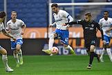Российская Премьер-Лига (РПЛ). МИР - Чемпионат России по футболу 2022/2023. 23-й тур. Матч между командами "Динамо" (Москва) - "Пари НН" (Нижний Новгород) на стадионе "ВТБ Арена". Игрок команды "Динамо" Саба Сазонов во время матча.