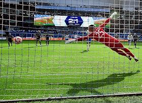 Российская Премьер-Лига (РПЛ). МИР - Чемпионат России по футболу 2022/2023. 23-й тур. Матч между командами "Динамо" (Москва) - "Пари НН" (Нижний Новгород) на стадионе "ВТБ Арена". Вратарь команды "Пари НН" Артур Нигматуллин во время матча.