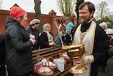 Великая Суббота. Священнослужитель и верующие во время чина освящения пасхальных куличей, яиц и пасхи в храме Святой Троицы в канун Светлого Христова Воскресения.