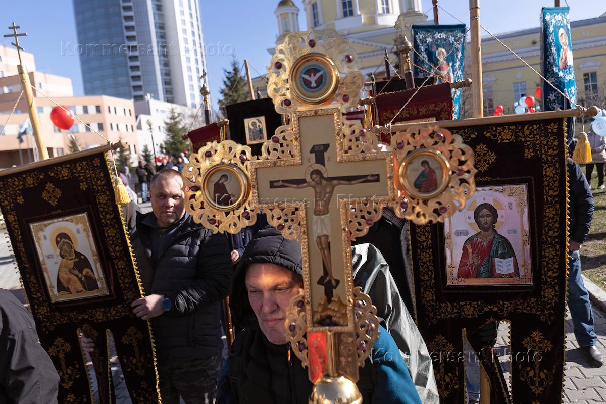 Празднование православной Пасхи. Крестный ход от Свято-Троицкого собора до Храма-на-Крови. Российский космонавт-испытатель Олег Артемьев (в центре) с иконой Святой Екатерины, которую брал с собой на орбиту, во время Крестного хода.
