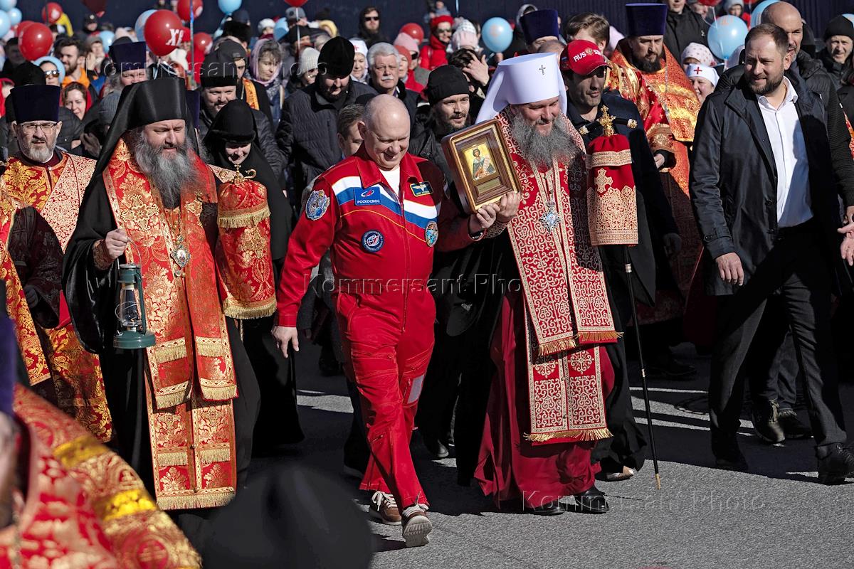 Празднование православной Пасхи. Крестный ход от Свято-Троицкого собора до Храма-на-Крови. Российский космонавт-испытатель Олег Артемьев (в центре) с иконой Святой Екатерины, которую брал с собой на орбиту, во время Крестного хода.