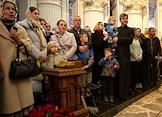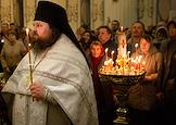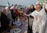 Великая Суббота. Чин освящения пасхальных куличей, яиц и пасхи в канун Светлого Христова Воскресения (Пасха) в Cтавропигиальном Воскресенском Новоиерусалимском мужском монастыре Русской православной церкви. Жанровая фотография. Священник во время обряда освящения куличей и яиц.