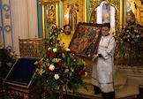 Пасхальная служба в Cтавропигиальном Воскресенском Новоиерусалимском мужском монастыре Русской православной церкви. Жанровая фотография. Священнослужители выносят икону во время службы.