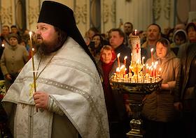 Пасхальная служба в Cтавропигиальном Воскресенском Новоиерусалимском мужском монастыре Русской православной церкви. Жанровая фотография. Священнослужитель с горящей свечой в руке во время службы.