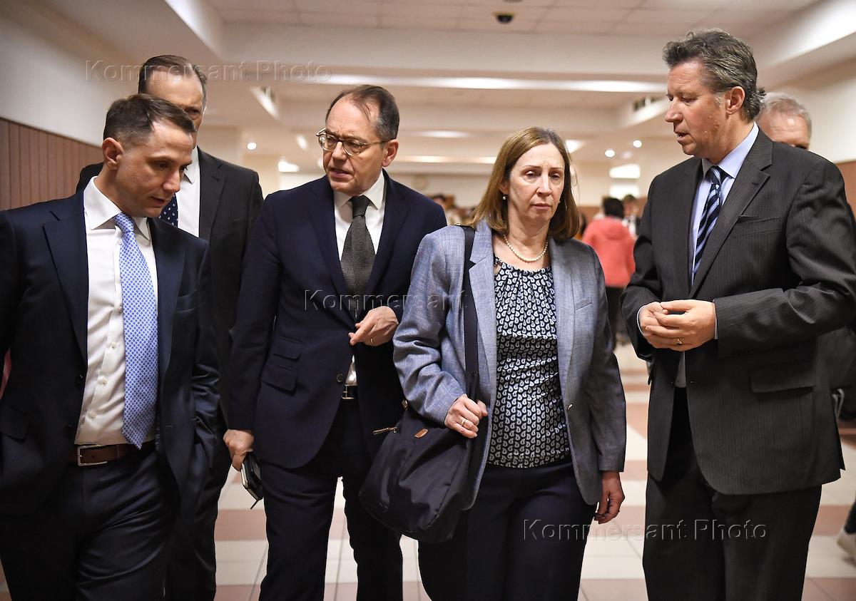 Вынесение приговора публицисту и общественному деятелю Владимиру Кара-Мурзе (признан в России иноагентом), подозреваемого по уголовному делу о распространении ложных сведений о Вооруженных силах России в Московском городском суде. Чрезвычайный и Полномочный посол Соединенных Штатов Америки (США) в России Линн Трейси (в центре) и посол Великобритании в России Дебора Джейн Броннерт (справа) в здании суда.
