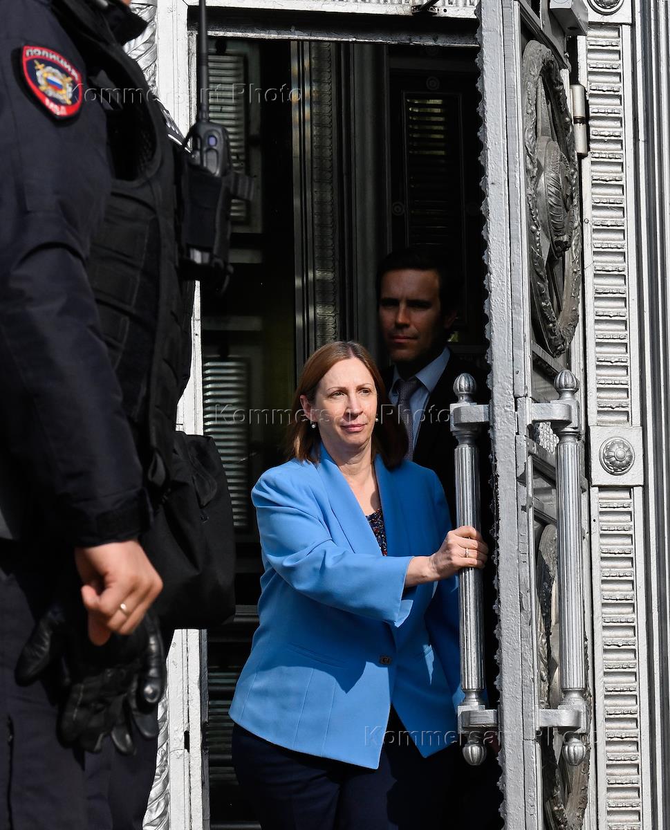 Послы Великобритании, США и Канады вызваны в МИД России из-за грубого вмешательства в дела России и деятельности, не соответствующей дипломатическому статусу. Посол США в России Линн Трейси (справа) выходит из здания Министерства иностранных дел России.