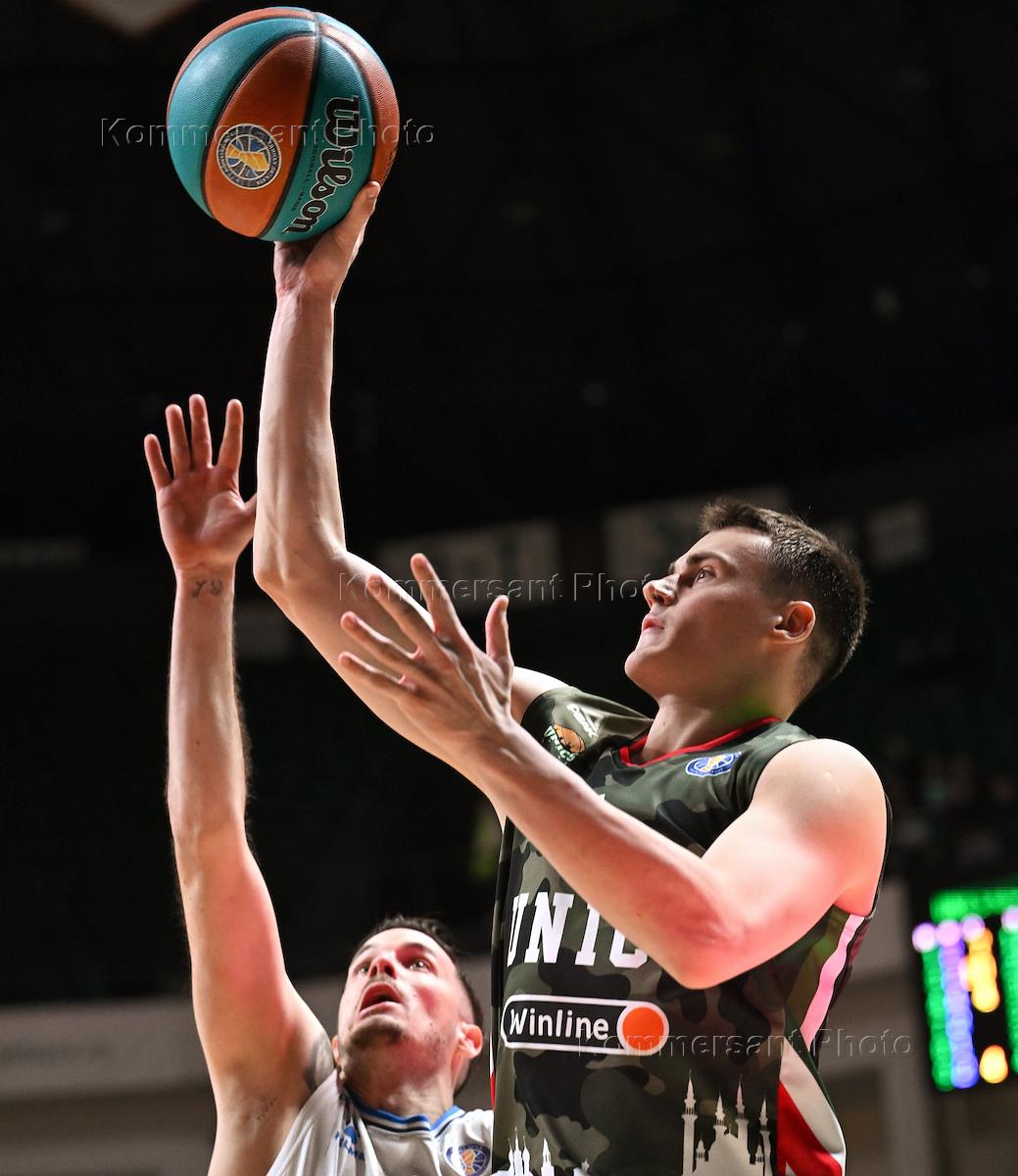 Единая лига ВТБ по баскетболу. 1/2 финала. Матч между командами УНИКС (Казань) - "Зенит" (Санкт-Петербург) на стадионе "Баскет-холл". Игрок команды УНИКС Георгий Жбанов (справа) и игрок команды "Зенит" Артем Клименко (слева) во время матча.