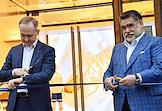 Открытый фестиваль искусств "Черешневый лес". Церемония открытия магазина "Динамо" и выставки "Динамо: на все сто!" в ГУМе. Председатель наблюдательного совета компании Bosco di Ciliegi Михаил Куснирович (справа) и помощник президента России Игорь Левитин (слева) на церемонии.