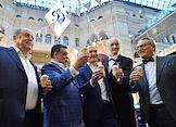 Открытый фестиваль искусств "Черешневый лес". Церемония открытия магазина "Динамо" и выставки "Динамо: на все сто!" в ГУМе. Слева направо: руководитель Объединения отечественных футбольных тренеров (ООФТ) Михаил Гершкович, председатель наблюдательного совета компании Bosco di Ciliegi Михаил Куснирович, генеральный директор футбольного клуба "Динамо" Павел Пивоваров и архивариус клуба "Динамо" Юрий Кошель на церемонии.