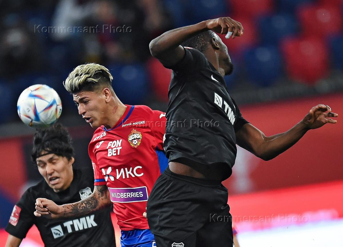 Фонбет - Кубок России по футболу 2022/23. Матч между командами ЦСКА (Москва) - "Урал" (Екатеринбург) на стадионе "ВЭБ Арена". Слева направо: игрок команды ЦСКА Мойзес, игрок команды "Урал" Лазар Ранджелович и игрок команды ЦСКА Виктор Мендес во время матча.