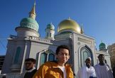 Праздничные мероприятия в день Ураза Байрам в Московской Соборной мечети. Жанровая фотография. Верующие у Московской Соборной мечети.