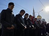 Праздничные мероприятия в день Ураза Байрам в Московской Соборной мечети. Жанровая фотография. Верующие во время намаза.