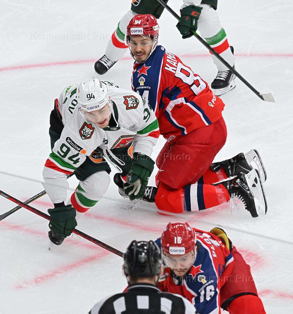 Континентальная хоккейная лига (КХЛ). Чемпионат сезона 2022/23. Плей-офф Кубка Гагарина. Финал. 3-й матч. Матч между командами ЦСКА (Москва) - "Ак Барс" (Казань) на стадионе "ЦСКА Арена". Игроки команды ЦСКА Николай Макаров (второй слева), Максим Соркин (второй справа), игроки команды "Ак Барс" Дмитрий Кагарлицкий (слева) и Вадим Шипачев (справа) во время матча.