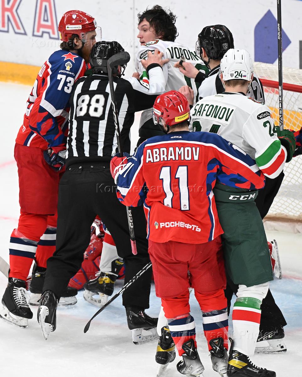 Континентальная хоккейная лига (КХЛ). Чемпионат сезона 2022/23. Плей-офф Кубка Гагарина. Финал. 3-й матч. Матч между командами ЦСКА (Москва) - "Ак Барс" (Казань) на стадионе "ЦСКА Арена". Игроки команды ЦСКА Николай Макаров (второй слева), Максим Соркин (второй справа), игроки команды "Ак Барс" Дмитрий Кагарлицкий (слева) и Вадим Шипачев (справа) во время матча.