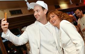 45-й Московский международный кинофестиваль (ММКФ). Ежегодная White Party и церемония вручения премии "Аванс" журнала "Кинорепортер" в ресторане "Чаiка". Фотограф Владимир Широков (слева) и актриса Елизавета Арзамасова (в центре) на церемонии.