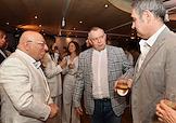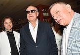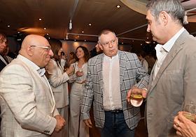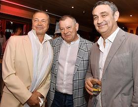45-й Московский международный кинофестиваль (ММКФ). Ежегодная White Party и церемония вручения премии "Аванс" журнала "Кинорепортер" в ресторане "Чаiка". Слева направо: актеры Михаил Багдасаров, Вадим Андреев и Сергей Юшкевич на церемонии.