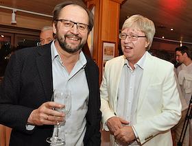 45-й Московский международный кинофестиваль (ММКФ). Ежегодная White Party и церемония вручения премии "Аванс" журнала "Кинорепортер" в ресторане "Чаiка". Кинорежиссер Андрей Кравчук (слева) и директор Центра исследований культурной среды философского факультета МГУ имени М. В. Ломоносова, руководитель исследований факультета креативных индустрий Национального исследовательского университета "Высшая школа экономики" Олег Иванов (справа) на церемонии.