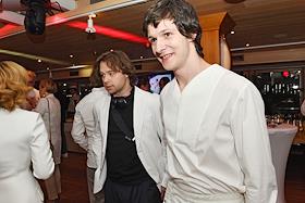 45-й Московский международный кинофестиваль (ММКФ). Ежегодная White Party и церемония вручения премии "Аванс" журнала "Кинорепортер" в ресторане "Чаiка". Актеры Кузьма Котрелёв (справа) и Виталий Гогунский (слева) на церемонии.