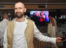 45-й Московский международный кинофестиваль (ММКФ). Ежегодная White Party и церемония вручения премии "Аванс" журнала "Кинорепортер" в ресторане "Чаiка". Актер Виталий Гогунский (в центре) на церемонии.