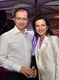 45-й Московский международный кинофестиваль (ММКФ). Ежегодная White Party и церемония вручения премии "Аванс" журнала "Кинорепортер" в ресторане "Чаiка". Помощник президента России Владимир Мединский (слева) и актриса Анна Пескова (справа) на церемонии.