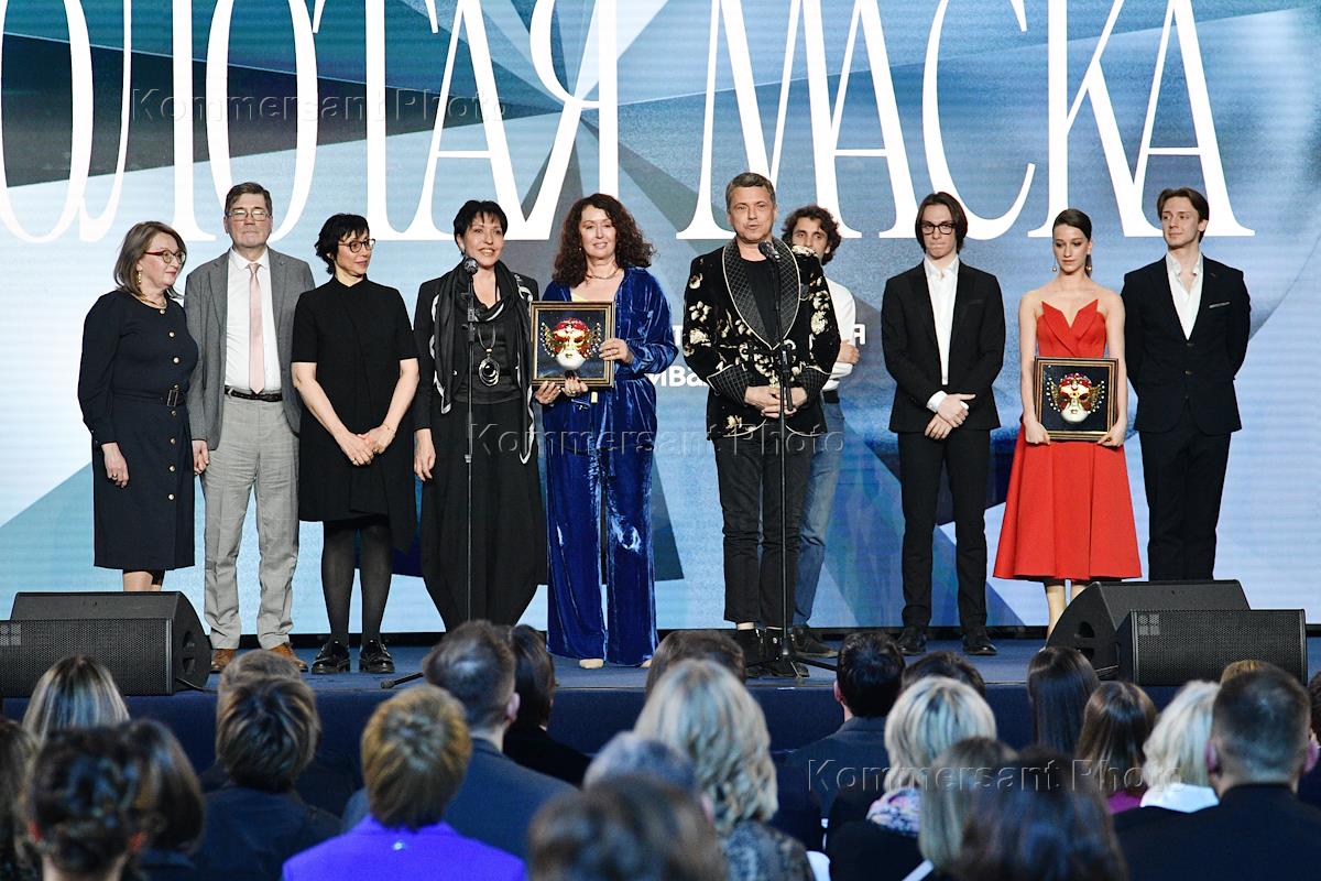 Театральный фестиваль "Золотая маска". Торжественная церемония вручения Российской национальной театральной премии "Золотая маска 2023" на сцене Московского академического Музыкального театра К. С. Станиславского и В. И. Немировича-Данченко. Творческая группа спектакля "Катарина, или Дочь разбойника", поставленного на сцене Театра оперы и балета имени Д. А. Хворостовского (Красноярск).