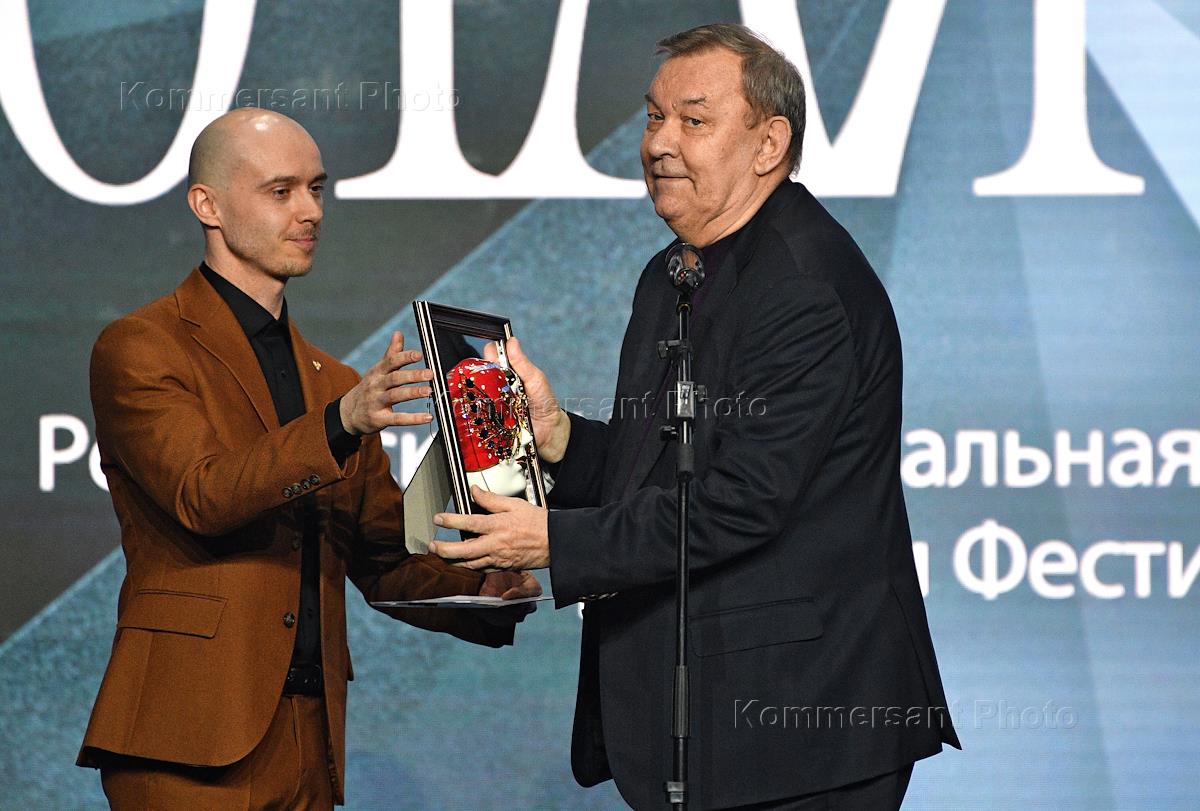 Театральный фестиваль "Золотая маска". Торжественная церемония вручения Российской национальной театральной премии "Золотая маска 2023" на сцене Московского академического Музыкального театра К. С. Станиславского и В. И. Немировича-Данченко. Директор Московского театра "Новая опера" Антон Гетьман (слева) и театральный художник Зиновий Марголин (справа) во время церемонии.