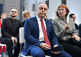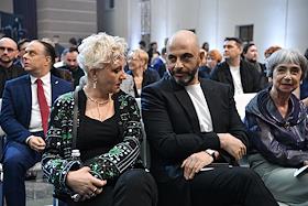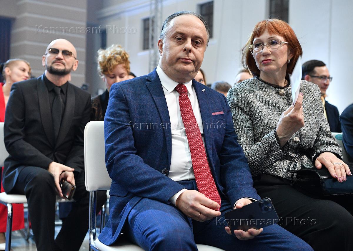 Театральный фестиваль "Золотая маска". Торжественная церемония вручения Российской национальной театральной премии "Золотая маска 2023" на сцене Московского академического Музыкального театра К. С. Станиславского и В. И. Немировича-Данченко. Художественный руководитель Государственного Московского Еврейского театра "Шалом" Олег Липовецкий (в центре) и театральный критик, главный редактор газеты "Экран и сцена" Екатерина Дмитриевская (справа) во время церемонии.