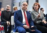 Театральный фестиваль "Золотая маска". Торжественная церемония вручения Российской национальной театральной премии "Золотая маска 2023" на сцене Московского академического Музыкального театра К. С. Станиславского и В. И. Немировича-Данченко. Директор Московского театра "Новая опера" Антон Гетьман (слева) и театральный художник Зиновий Марголин (справа) во время церемонии.
