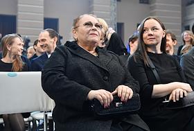 Театральный фестиваль "Золотая маска". Торжественная церемония вручения Российской национальной театральной премии "Золотая маска 2023" на сцене Московского академического Музыкального театра К. С. Станиславского и В. И. Немировича-Данченко. Слева направо: актриса Нина Усатова, художественный руководитель Государственного Московского Еврейского театра "Шалом" Олег Липовецкий и театральный критик, главный редактор газеты "Экран и сцена" Екатерина Дмитриевская во время церемонии.