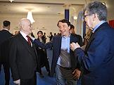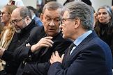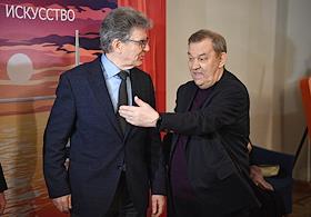 Театральный фестиваль "Золотая маска". Торжественная церемония вручения Российской национальной театральной премии "Золотая маска 2023" на сцене Московского академического Музыкального театра К. С. Станиславского и В. И. Немировича-Данченко. Президент премии и фестиваля "Золотая маска", актер Игорь Костолевский (слева) и генеральный директор Государственного академического Большого театра Владимир Урин (справа) перед началом церемонии.