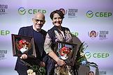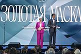 Театральный фестиваль "Золотая маска". Торжественная церемония вручения Российской национальной театральной премии "Золотая маска 2023" на сцене Московского академического Музыкального театра К. С. Станиславского и В. И. Немировича-Данченко. Актриса Анастасия Макеева (слева) и художественный руководитель театра "Зазеркалье" Александр Петров (справа) во время церемонии.