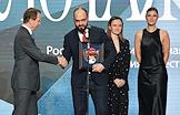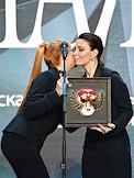 Театральный фестиваль "Золотая маска". Торжественная церемония вручения Российской национальной театральной премии "Золотая маска 2023" на сцене Московского академического Музыкального театра К. С. Станиславского и В. И. Немировича-Данченко. Актриса Анастасия Стоцкая (слева) и художественный руководитель Пермского академического Театра-Театра Борис Мильграм (третий справа) во время церемонии.