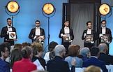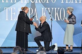 Театральный фестиваль "Золотая маска". Торжественная церемония вручения Российской национальной театральной премии "Золотая маска 2023" на сцене Московского академического Музыкального театра К. С. Станиславского и В. И. Немировича-Данченко. Творческая группа спектакля "Катарина, или Дочь разбойника", поставленного на сцене Театра оперы и балета имени Д. А. Хворостовского (Красноярск).