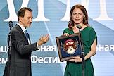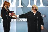 Театральный фестиваль "Золотая маска". Торжественная церемония вручения Российской национальной театральной премии "Золотая маска 2023" на сцене Московского академического Музыкального театра К. С. Станиславского и В. И. Немировича-Данченко. Актриса Анна Чиповская (справа) во время церемонии.