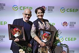 Театральный фестиваль "Золотая маска". Торжественная церемония вручения Российской национальной театральной премии "Золотая маска 2023" на сцене Московского академического Музыкального театра К. С. Станиславского и В. И. Немировича-Данченко. Балерина Елена Свинко (слева) и хореограф Павел Глухов во время церемонии.