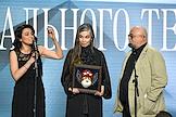 Театральный фестиваль "Золотая маска". Торжественная церемония вручения Российской национальной театральной премии "Золотая маска 2023" на сцене Московского академического Музыкального театра К. С. Станиславского и В. И. Немировича-Данченко. Режиссер Полина Кардымон (справа) во время церемонии.