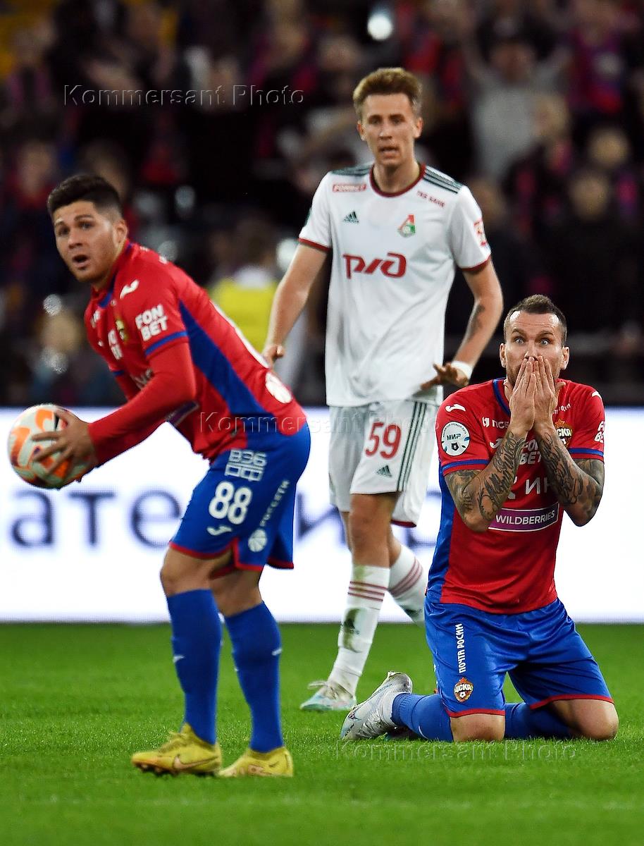Российская Премьер-Лига (РПЛ). МИР - Чемпионат России по футболу 2022/2023. 24-й тур. Матч между командами ЦСКА (Москва) - "Локомотив" (Москва) на стадионе "ВЭБ Арена". Игрок команды ЦСКА Саша Зделар (слева) во время матча.