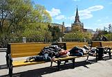 Виды Москвы. Манежная площадь. Жанровая фотография. Мужчины спят на лавках.