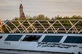 Жанровая фотография. Затонувшее судно "Агитатор" в акватории Кожуховского затона Москвы-реки. Надпись на борту судна "Власть рождает паразитов-да здравствует анархия!".